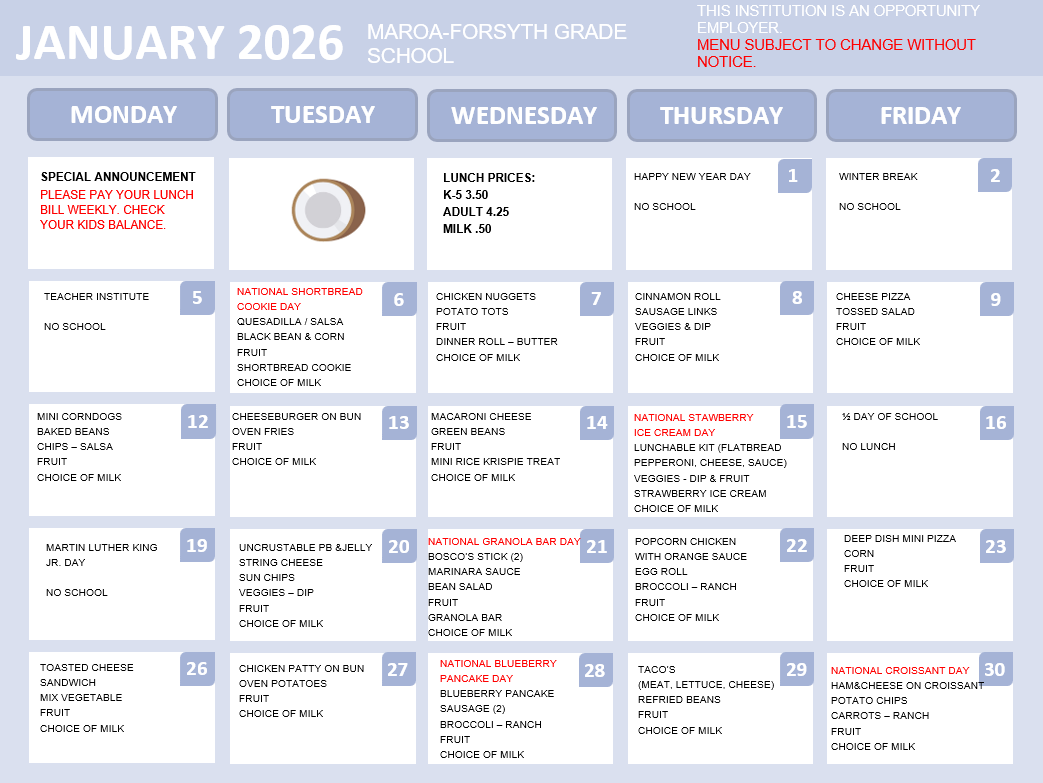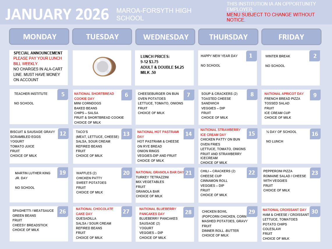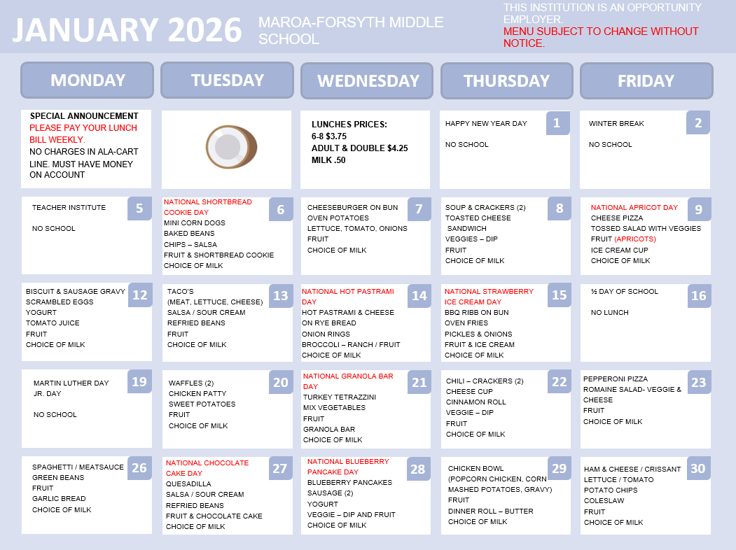 January 2026 Menus